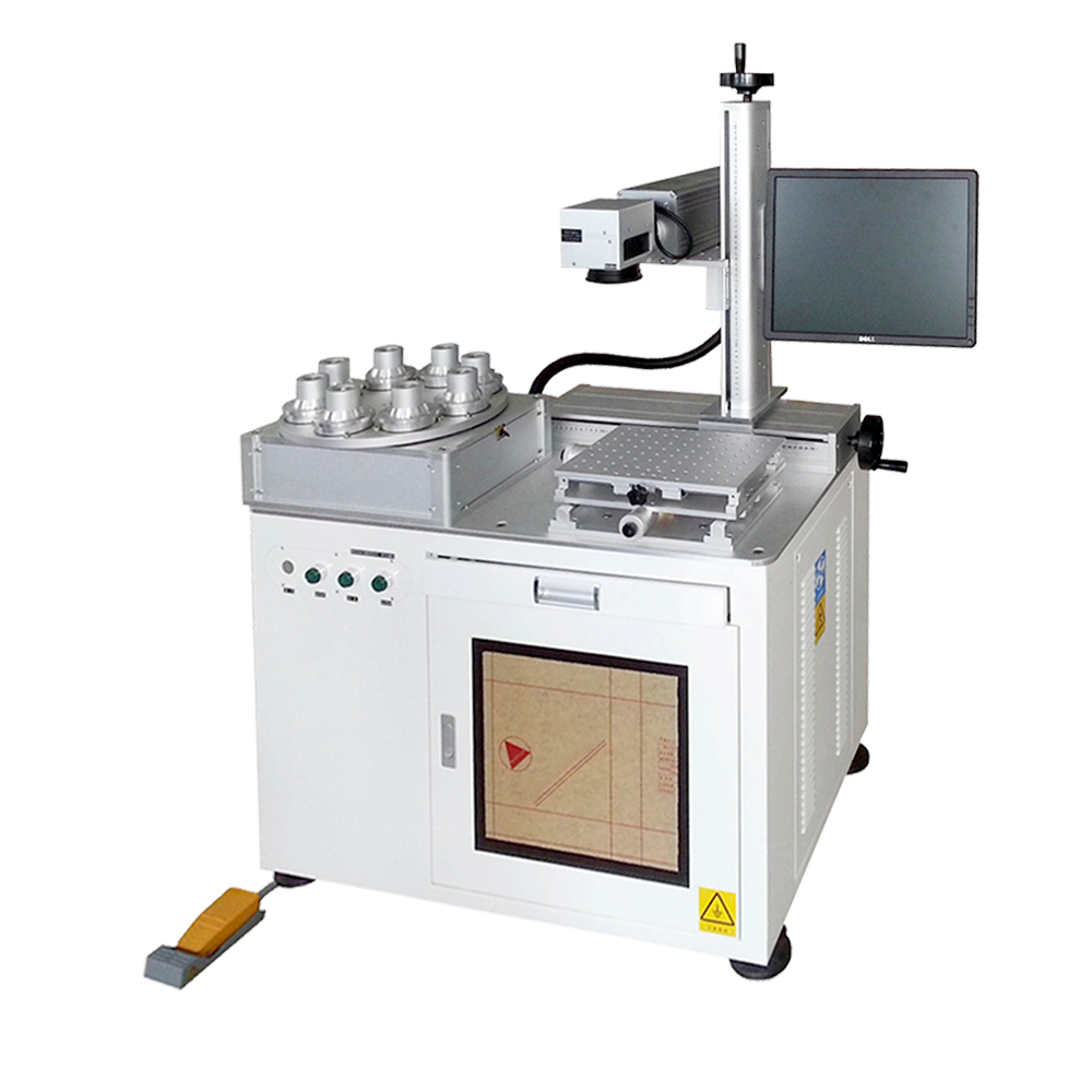 LED激光打標(biāo)機(jī)采用八工位(視產(chǎn)品具體情況可設(shè)計(jì)為6工位或4工位)3D立體旋轉(zhuǎn)轉(zhuǎn)盤設(shè)計(jì),光路X、Z軸手動(dòng)移動(dòng)可調(diào),單個(gè)工位之間獨(dú)立工作,自動(dòng)360°旋轉(zhuǎn),減少上下料時(shí)間,提高工作效率。適用于產(chǎn)量在10K/d以上的球泡燈、要求打雙面、三面或360°旋轉(zhuǎn)打標(biāo)的產(chǎn)品等,整臺(tái)機(jī)器的操作只需要普通人工進(jìn)行手動(dòng)上料一個(gè)簡(jiǎn)易環(huán)節(jié),雙工作臺(tái),平面打標(biāo),圓周打標(biāo)一機(jī)兩用,操作簡(jiǎn)單,速度快,效率高,標(biāo)刻清晰,無(wú)損耗。