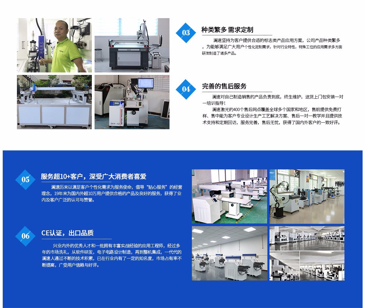 瀾速激光的售后網(wǎng)點覆蓋全球多個國家和地區(qū),售前提供免費打樣、售中能為客戶專業(yè)設(shè)計生產(chǎn)工藝解決方案、售后一對一教學(xué)并且提供技術(shù)支持和定期回訪,服務(wù)完善,售后無憂,獲得了國內(nèi)外客戶的一致好評。