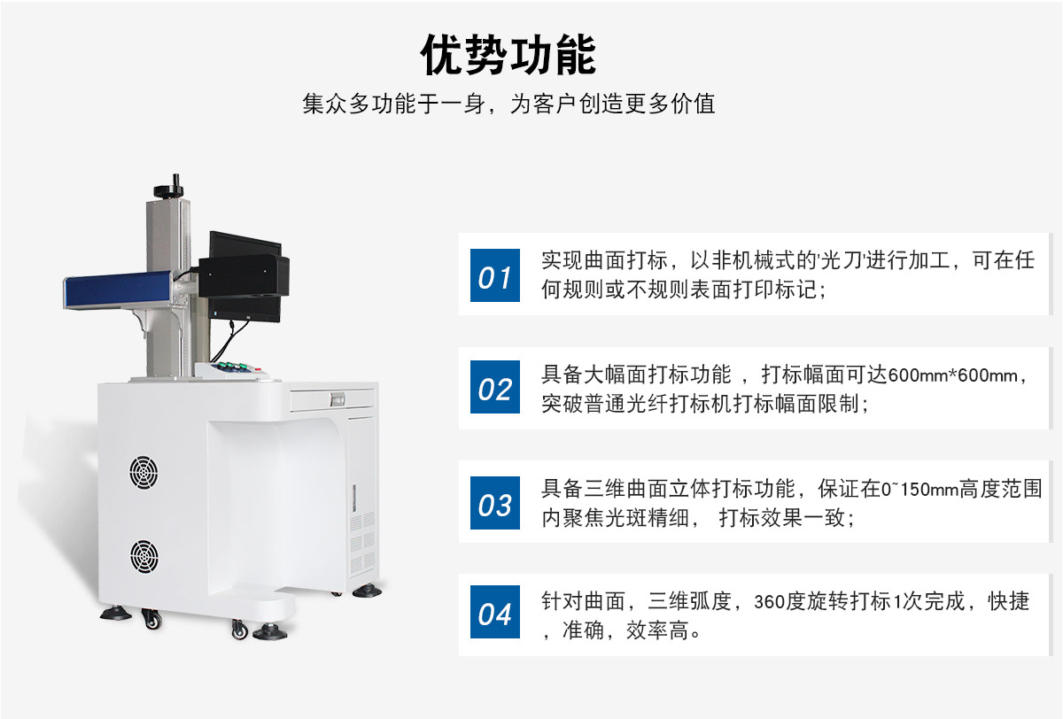 激光打標(biāo)機三大特色:三維曲面立體激光打標(biāo)、可勝任大幅面激光打標(biāo)、三軸動態(tài)聚焦技術(shù)。