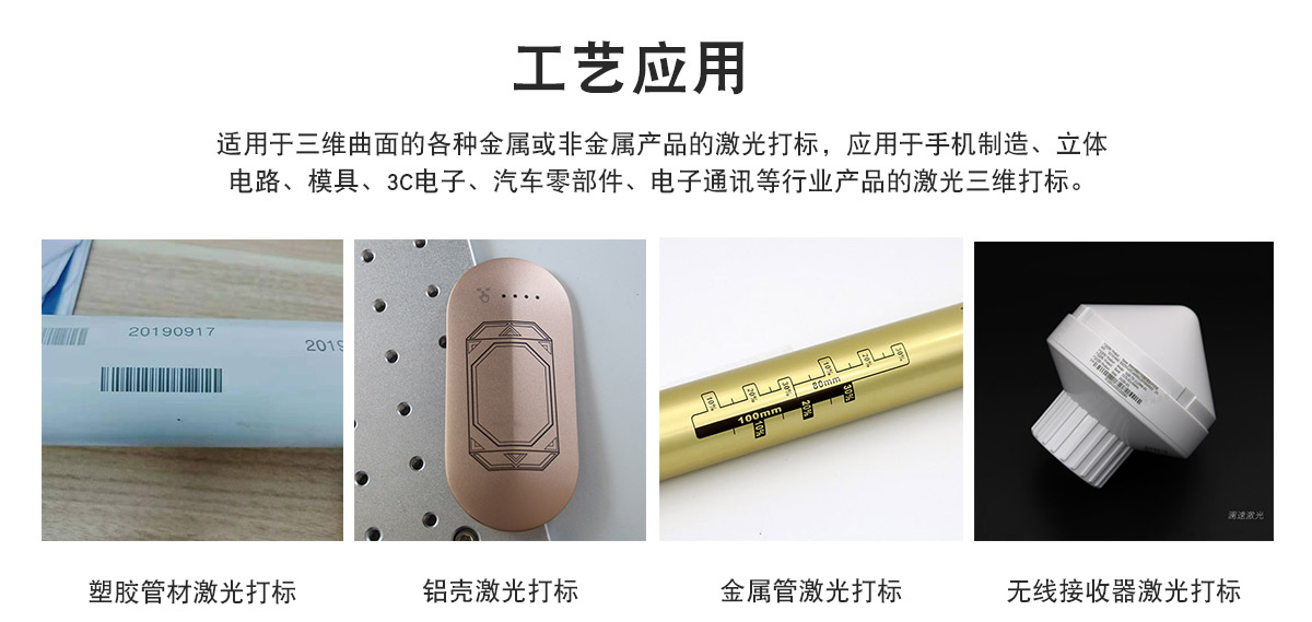適用于三維曲面的各種金屬或非金屬產(chǎn)品的激光打標(biāo),廣泛應(yīng)用于手機制造、立體電路、 醫(yī)療器械、模具、3C電子、汽車零部件、電子通訊等行業(yè)產(chǎn)品的激光三維標(biāo)記。